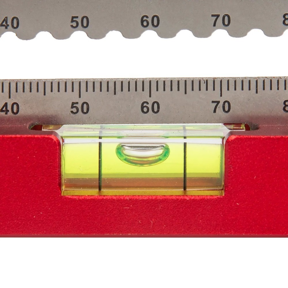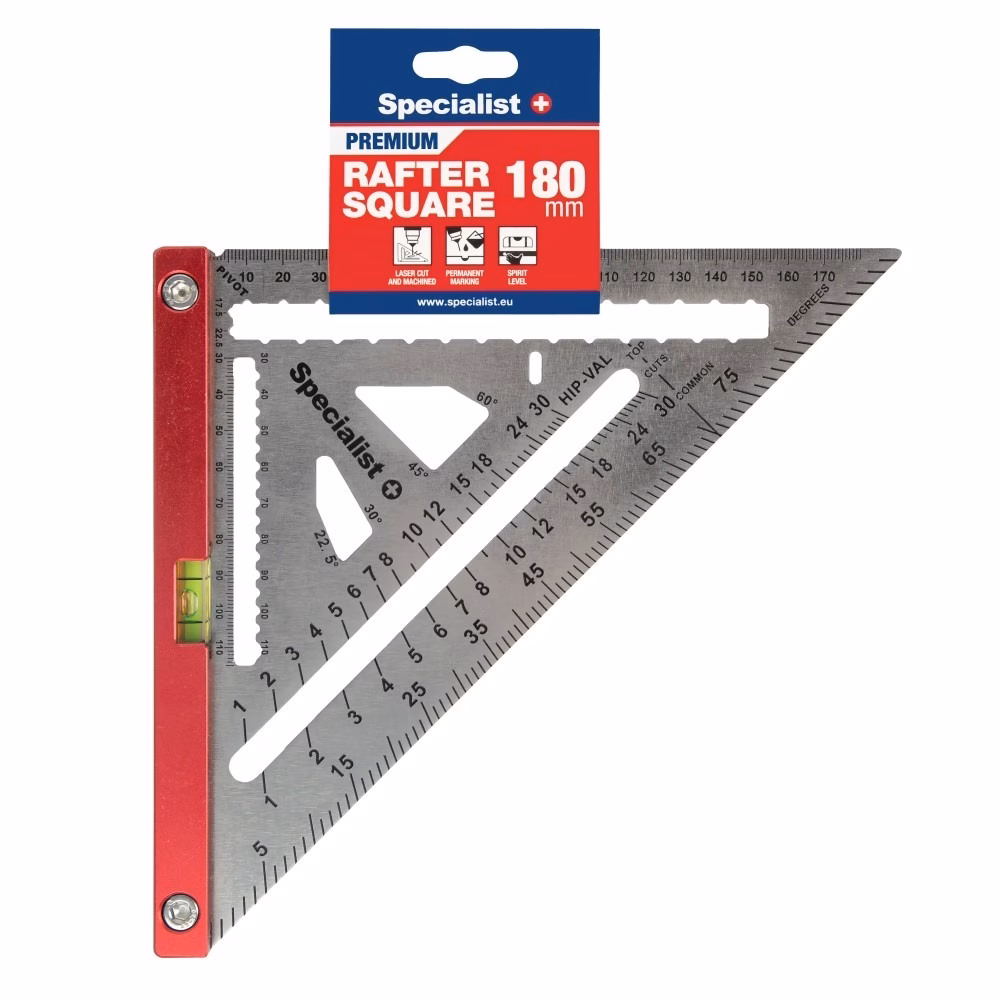 Kõrgekvaliteediline Specialist+ mõõtekolmnurk, valmistatud roostevabast terasest korpusest, millel on anodeeritud alumiiniumist serv ja integreeritud lood.