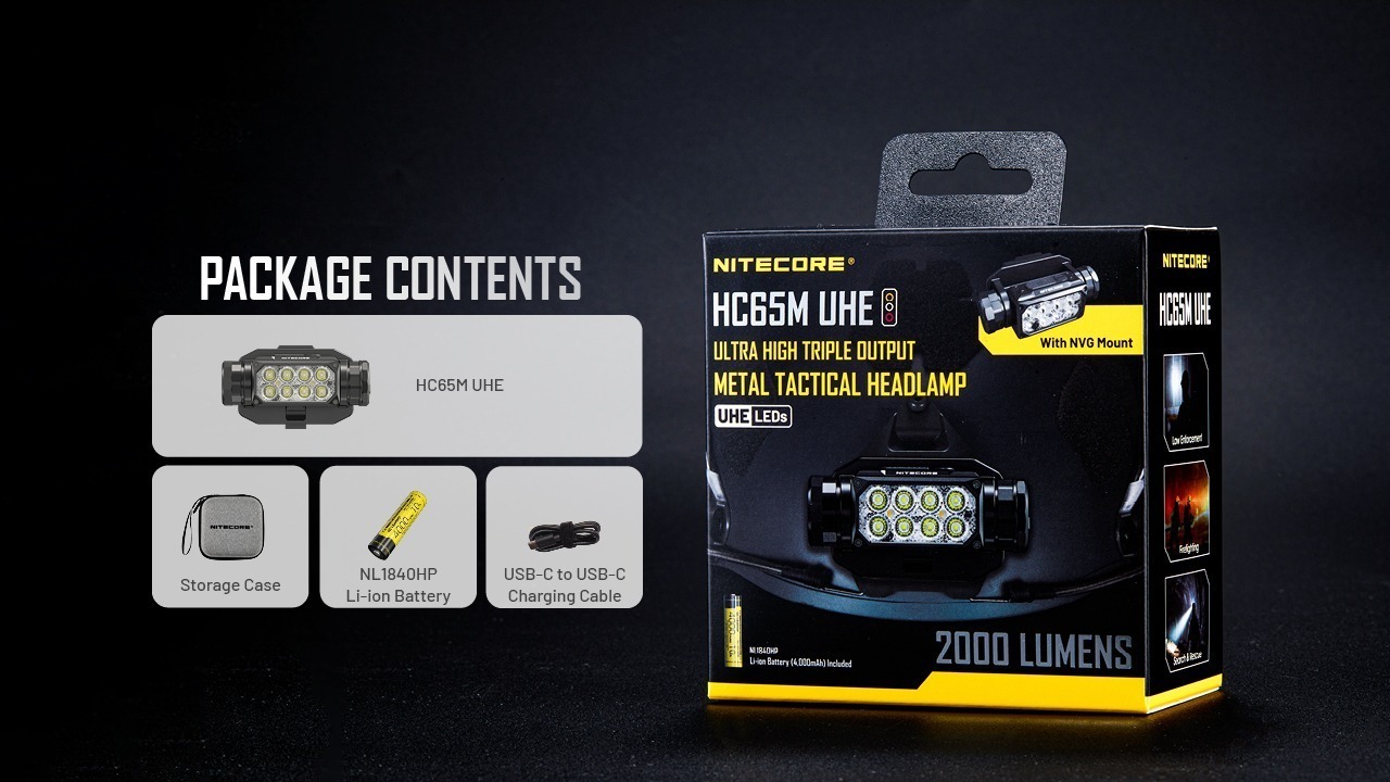 Pealamp Nitecore HC65M UHE, taktikaline. 2000lm valgusvihu ulatus kuni 220m. USB-C laetav, NVG kinnitusega.